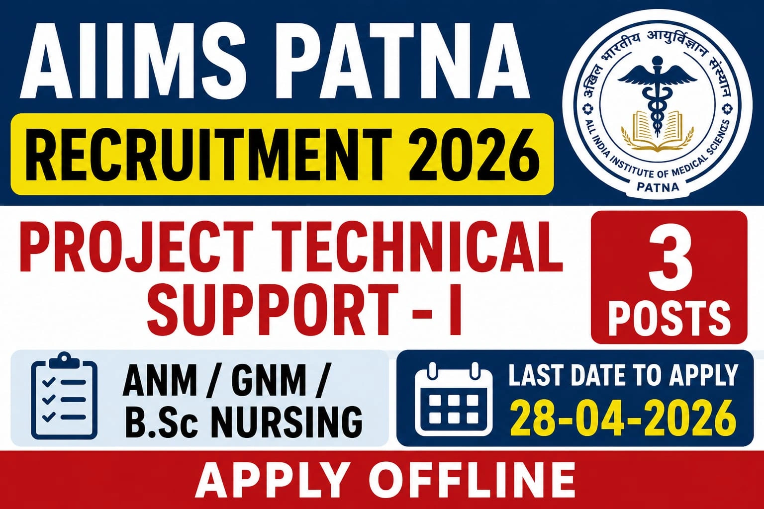 AIIMS Patna Recruitment 2026 : अगर आप हेल्थ सेक्टर में नौकरी की तलाश कर रहे हैं, तो आपके लिए शानदार मौका है। AIIMS Patna Project Technical Support I Recruitment 2026 के तहत कुल 3 पदों पर भर्ती निकाली गई है। खास बात यह है कि इसमें ANM, GNM या B.Sc Nursing वाले उम्मीदवार आवेदन कर सकते हैं और आवेदन प्रक्रिया ऑफलाइन है।