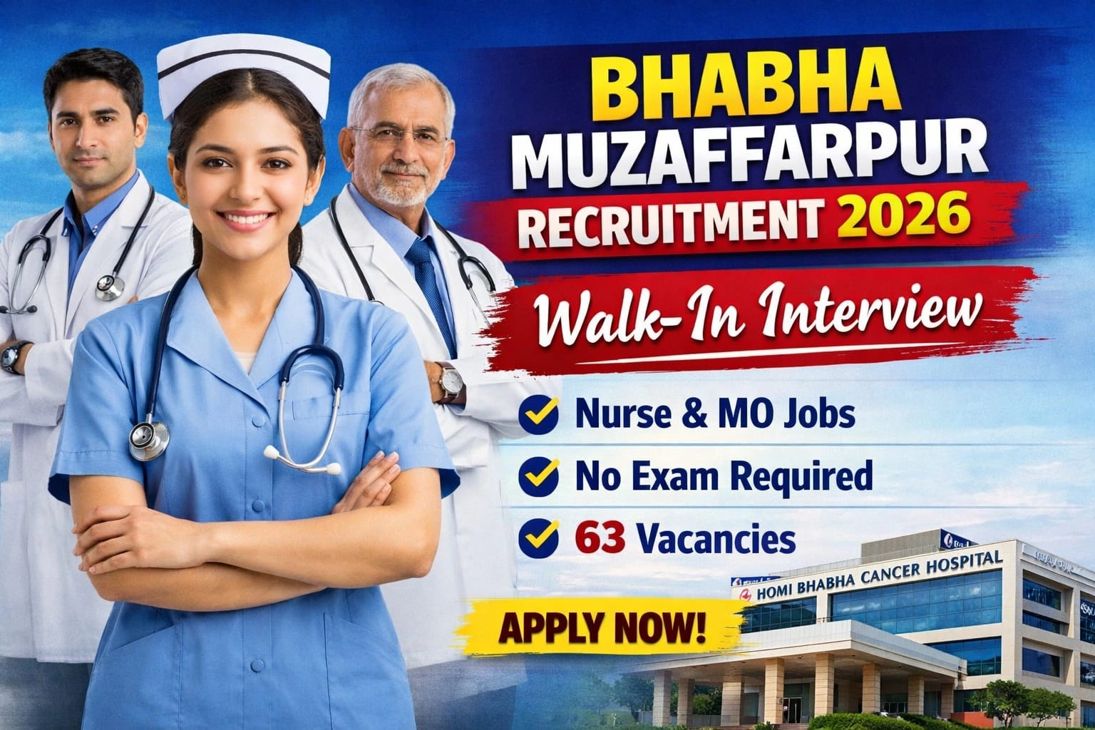 BHABHA Muzaffarpur Recruitment 2026: अगर आप स्वास्थ्य विभाग में नौकरी की तलाश कर रहे हैं तो आपके लिए एक शानदार मौका है। Homi Bhabha Cancer Hospital and Research Centre, Muzaffarpur (Bihar) की ओर से विभिन्न पदों पर भर्ती के लिए आधिकारिक सूचना जारी की गई है।