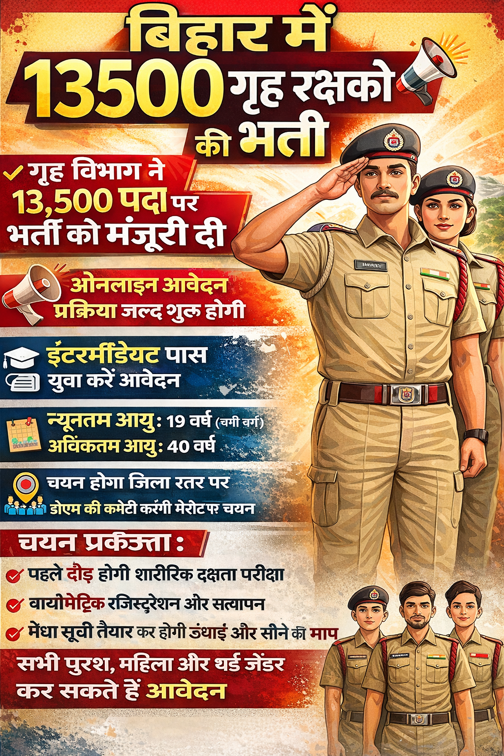 बिहार सरकार ने नए वित्तीय वर्ष में 13,500 गृह रक्षक (Home Guard) पदों पर भर्ती की मंजूरी दे दी है। गृह विभाग की स्वीकृति के बाद अब जल्द ही ऑनलाइन आवेदन प्रक्रिया शुरू होने वाली है।