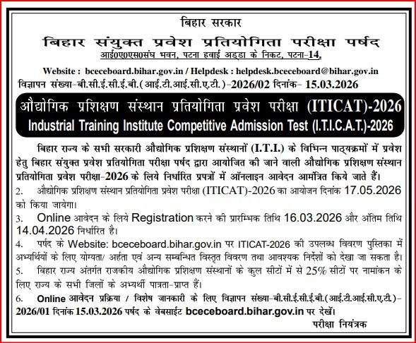 बिहार संयुक्त प्रवेश प्रतियोगिता परीक्षा पार्षद (BCECEB) बिहार सरकार द्वारा बिहार के विभिन्न सरकारी एवं प्राइवेट आईटीआई संसथान में एड्मिशन हेतु प्रवेश परीक्षा ली जाएगी जिसके लिए ऑनलाइन आवेदन माँगा गया है मेट्रिक पास लड़के एवं लड़की दोनों अपना आवेदन निर्धारित तिथि तक कर सकते हैं |बिहार संयुक्त प्रवेश प्रतियोगिता परीक्षा पर्षद (BCECEB) ने औद्योगिक प्रशिक्षण संस्थान प्रतियोगिता प्रवेश परीक्षा (ITICAT) 2026 के लिए ऑनलाइन आवेदन आमंत्रित किए हैं। यह परीक्षा बिहार राज्य के सभी सरकारी औद्योगिक प्रशिक्षण संस्थानों (ITI) में विभिन्न पाठ्यक्रमों में प्रवेश के लिए आयोजित की जाती है।