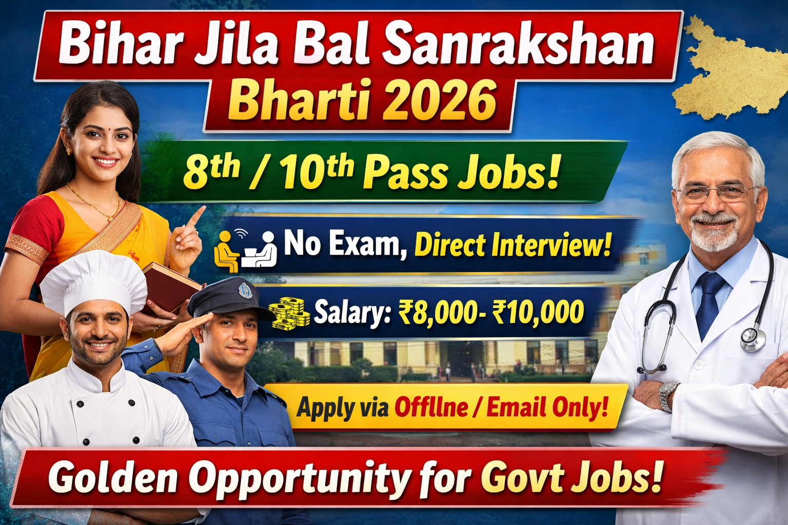 अगर आप कम पढ़ाई में सरकारी नौकरी की तलाश कर रहे हैं, तो आपके लिए बड़ी खुशखबरी है। Bihar Jila Baal Sanrakshan Bharti 2026 के तहत विभिन्न पदों पर भर्ती निकाली गई है। इस भर्ती में 8वीं और 10वीं पास उम्मीदवार भी आवेदन कर सकते हैं, जिससे यह एक शानदार अवसर बन जाता है।