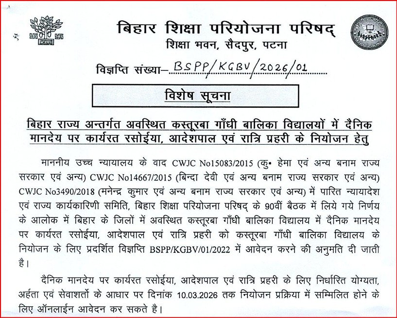 पूर्व में जारी विज्ञप्ति BSPP/KGBV/01/2022 के आधार पर चयन प्रक्रिया लंबित थी।