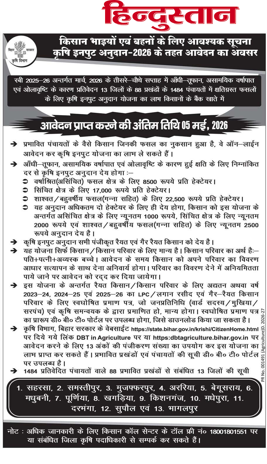 बिहार बाढ़ राहत योजना ऑनलाइन आवेदन, बिहार कृषि इनपुट अनुदान योजना 2026,