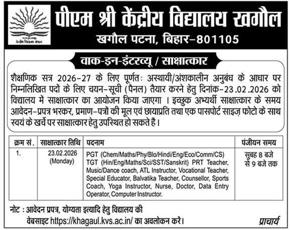 अगर आप शिक्षक बनने का सपना देख रहे हैं तो आपके लिए बड़ी खुशखबरी है। KVS Patna New Vacancy 2026 के तहत केन्द्रीय विद्यालयों में सत्र 2026-27 के लिए संविदा/अंशकालिक शिक्षकों की भर्ती प्रक्रिया शुरू हो चुकी है। यह भर्ती Walk-in-Interview के माध्यम से की जाएगी और इसमें विभिन्न विषयों के PGT, TGT, PRT सहित कई पद शामिल हैं। इस आर्टिकल में आपको योग्यता, पदों की सूची, चयन प्रक्रिया, आयु सीमा, वेतन और इंटरव्यू से जुड़ी पूरी जानकारी मिलेगी।