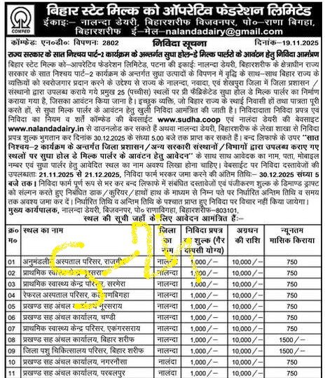 बिहार स्टेट मिल्क को-ऑपरेटिव फेडरेशन लिमिटेड (COMFED – Sudha Dairy) ने सुधा दूध एवं दुग्ध उत्पादों की खुदरा बिक्री (Retailer) के लिए आवेदन आमंत्रित किए हैं। यह भर्ती राज्य के विभिन्न जिलों में सुधा मिल्क पार्लर/कियोस्क आवंटन के लिए निकाली गई है।