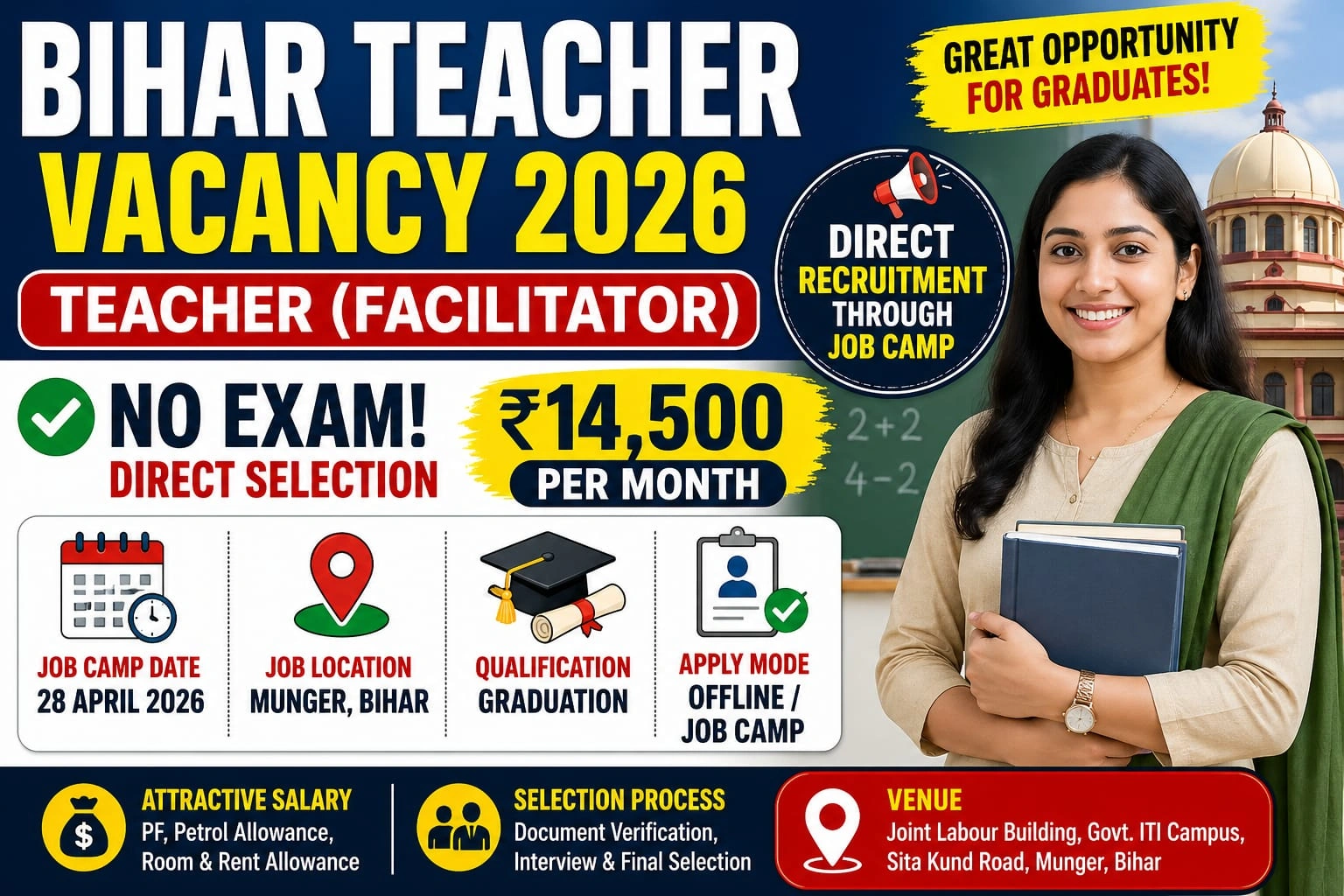 Bihar Teacher Facilitator Vacancy 2026 उन युवाओं के लिए एक शानदार मौका है जो बिना परीक्षा के शिक्षा क्षेत्र में नौकरी पाना चाहते हैं। आसान आवेदन प्रक्रिया, सीधा इंटरव्यू और आकर्षक वेतन इसे और भी खास बनाते हैं।
