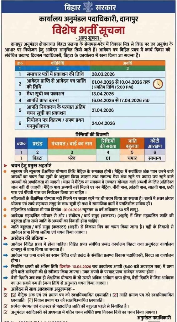 बिहार सरकार द्वारा दानापुर अनुमंडल के अंतर्गत विकास मित्र भर्ती 2026 के लिए विशेष सूचना जारी की गई है। यह भर्ती पटना जिले के बिहटा प्रखंड में की जाएगी। इच्छुक अभ्यर्थी निर्धारित तिथि के अंदर ऑफलाइन आवेदन कर सकते हैं।