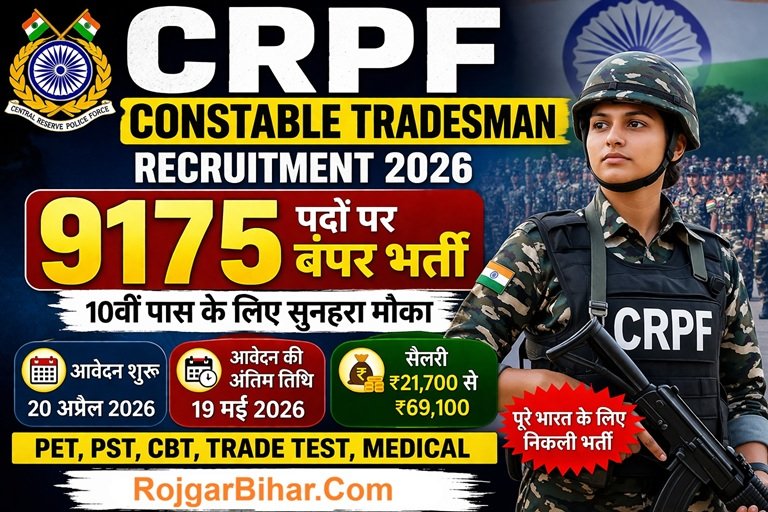 CRPF Constable Tradesman Recruitment 2026 एक शानदार मौका है उन उम्मीदवारों के लिए जो 10वीं पास होकर सरकारी नौकरी करना चाहते हैं। इसमें 9175 पदों पर भर्ती निकली है, इसलिए प्रतियोगिता भी अधिक होगी।
