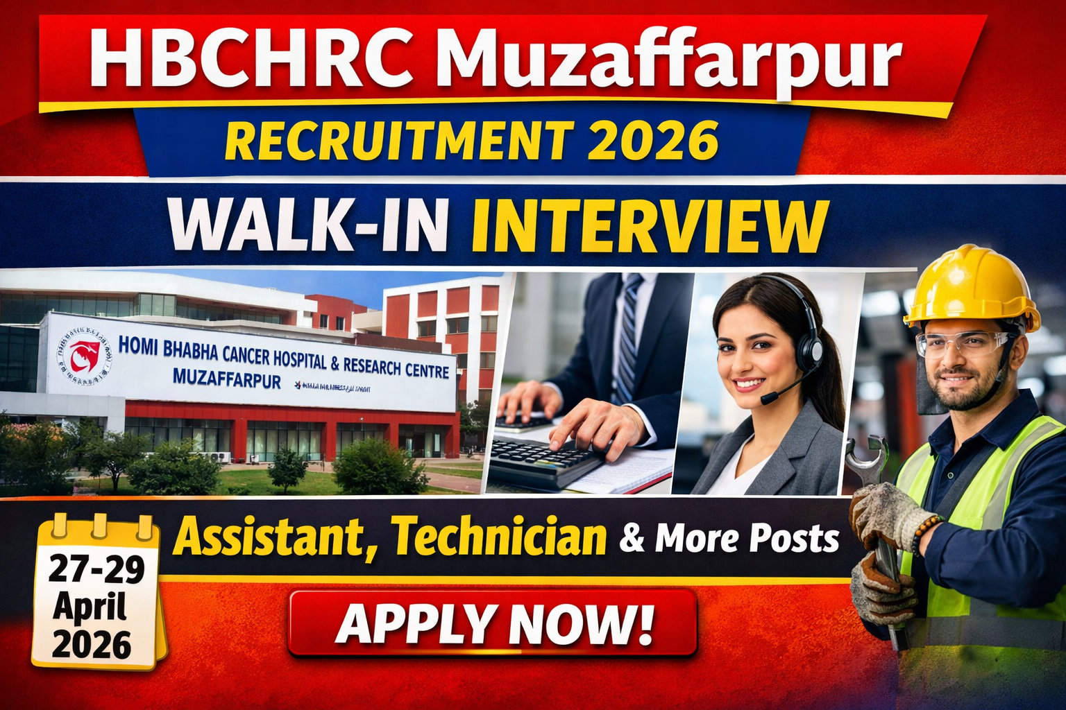 HBCHRC Muzaffarpur Recruitment 2026: Homi Bhabha Cancer Hospital & Research Center Muzaffarpur ने वर्ष 2026 के लिए Assistant, Technician और अन्य पदों पर भर्ती का नोटिफिकेशन जारी कर दिया है। इस भर्ती के तहत कुल 8 पदों को भरा जाएगा।