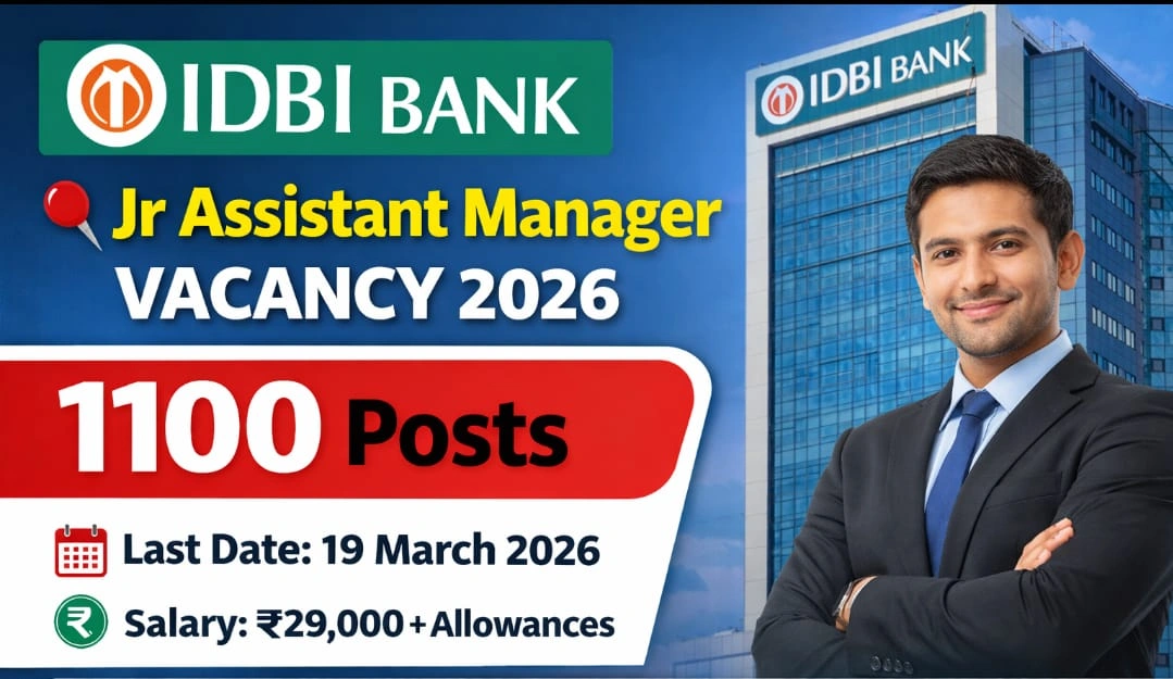 अगर आप बैंकिंग सेक्टर में सरकारी नौकरी की तैयारी कर रहे हैं, तो आपके लिए एक शानदार अवसर सामने आया है। Industrial Development Bank of India (IDBI Bank) ने Junior Assistant Manager (JAM) Grade ‘O’ Recruitment 2026 का आधिकारिक नोटिफिकेशन जारी कर दिया है। इस भर्ती के माध्यम से कुल 1100 पदों पर नियुक्ति की जाएगी। देशभर के योग्य उम्मीदवार इस भर्ती के लिए ऑनलाइन आवेदन कर सकते हैं।