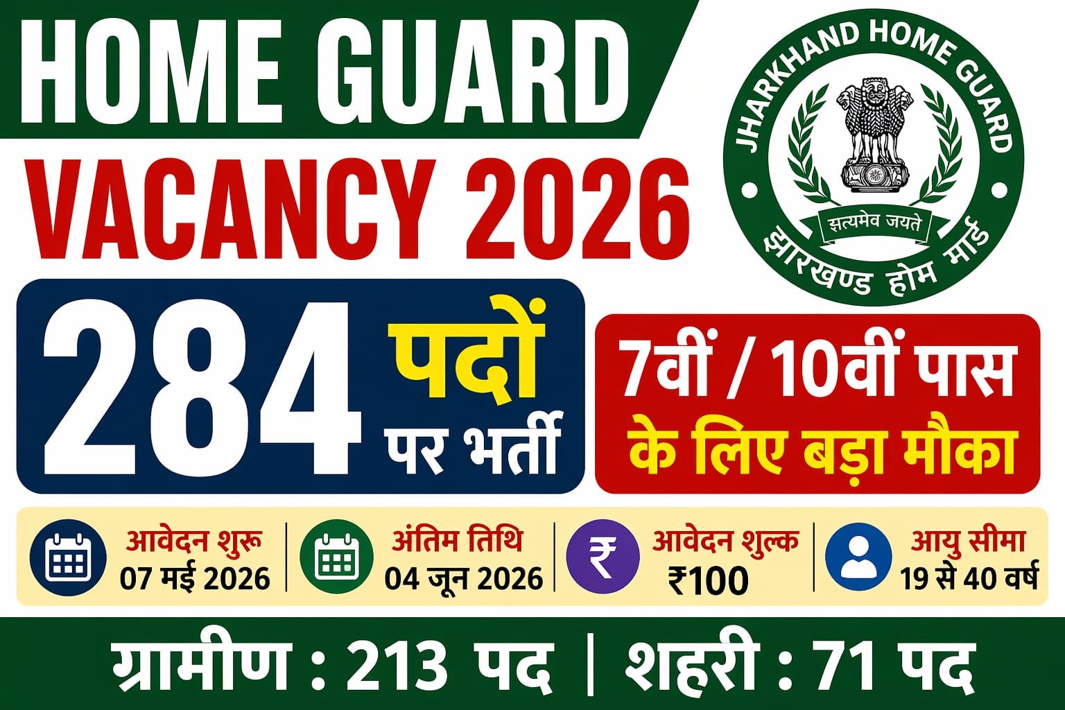 Jharkhand Home Guard Vacancy 2026 : Jharkhand Home Guard Vahini द्वारा Home Guard Vacancy 2026 का नोटिफिकेशन जारी कर दिया गया है। इस भर्ती में कुल 284 पद हैं, जिसमें ग्रामीण (213 पद) और शहरी (71 पद) शामिल हैं। यह भर्ती खास उन उम्मीदवारों के लिए है जो कम पढ़ाई (7वीं / 10वीं पास) के बाद भी सरकारी क्षेत्र से जुड़ना चाहते हैं।