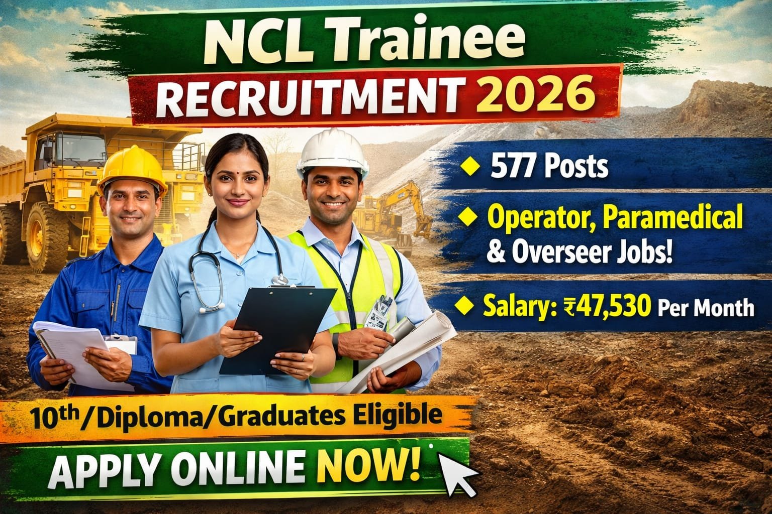 NCL Trainee Recruitment 2026 : अगर आप सरकारी सेक्टर में नौकरी की तलाश कर रहे हैं, तो Northern Coalfields Limited (NCL) की यह नई भर्ती आपके लिए शानदार अवसर है। इस भर्ती के तहत HEMM Operator, Paramedical Staff और Overseer (Civil) जैसे कुल 577 पदों पर भर्ती निकाली गई है।