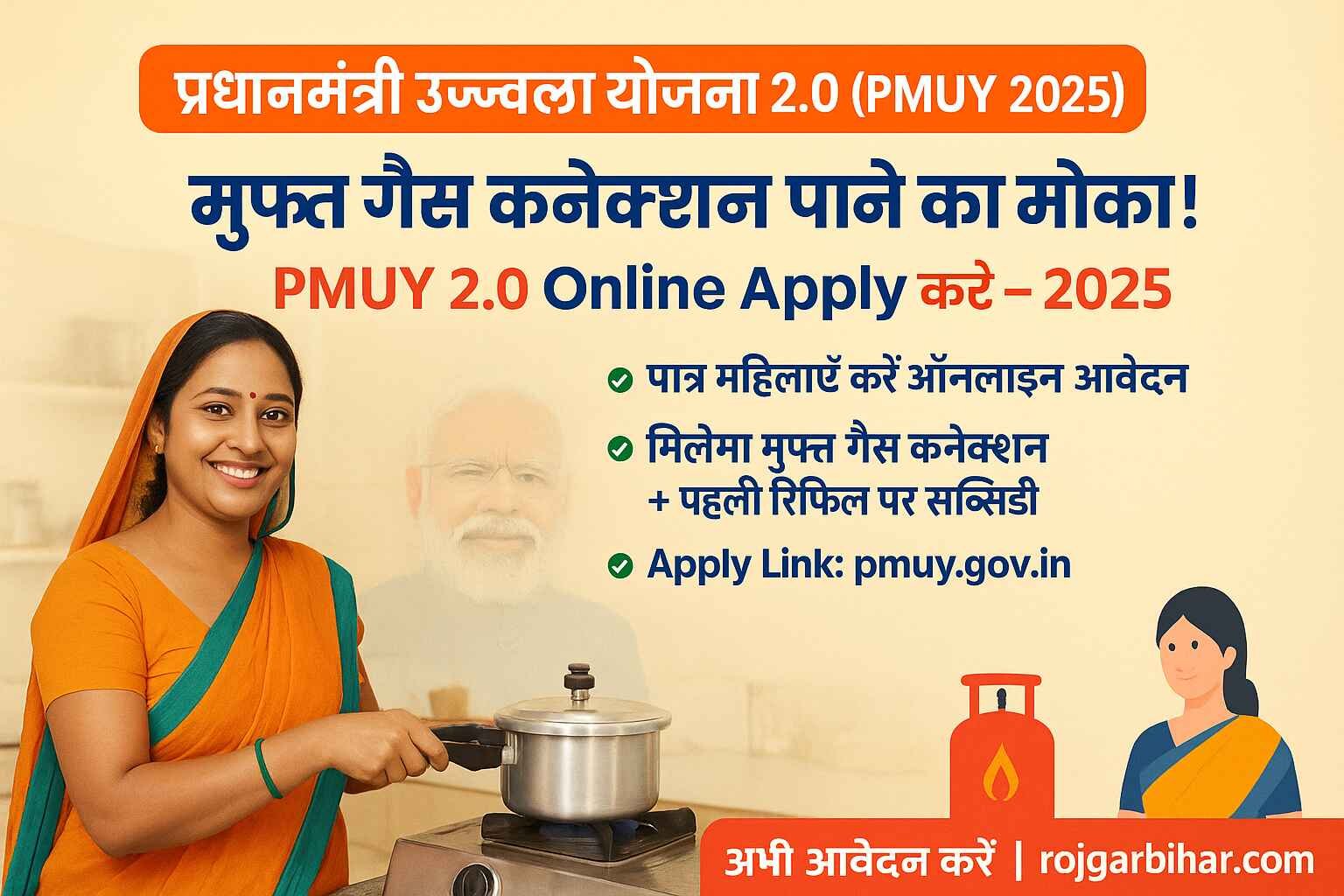 भारत सरकार द्वारा महिलाओं के सशक्तिकरण और स्वच्छ ऊर्जा को बढ़ावा देने के उद्देश्य से शुरू की गई प्रधानमंत्री उज्ज्वला योजना (PMUY) का दूसरा चरण यानी PMUY 2.0 अब 2025 में भी जारी है। इस योजना के तहत गरीब परिवारों की महिलाओं को मुफ़्त एलपीजी गैस कनेक्शन दिया जा रहा है, जिससे उन्हें लकड़ी, कोयले या गोबर के धुएं से राहत मिल सके। हम आपको इस भर्ती के बारे में महत्वपूर्ण जानकारी प्रदान करेंगे, जिसमें महत्वपूर्ण तिथियां, पात्रता मानदंड, आवेदन प्रक्रिया और अन्य विवरण शामिल हैं।