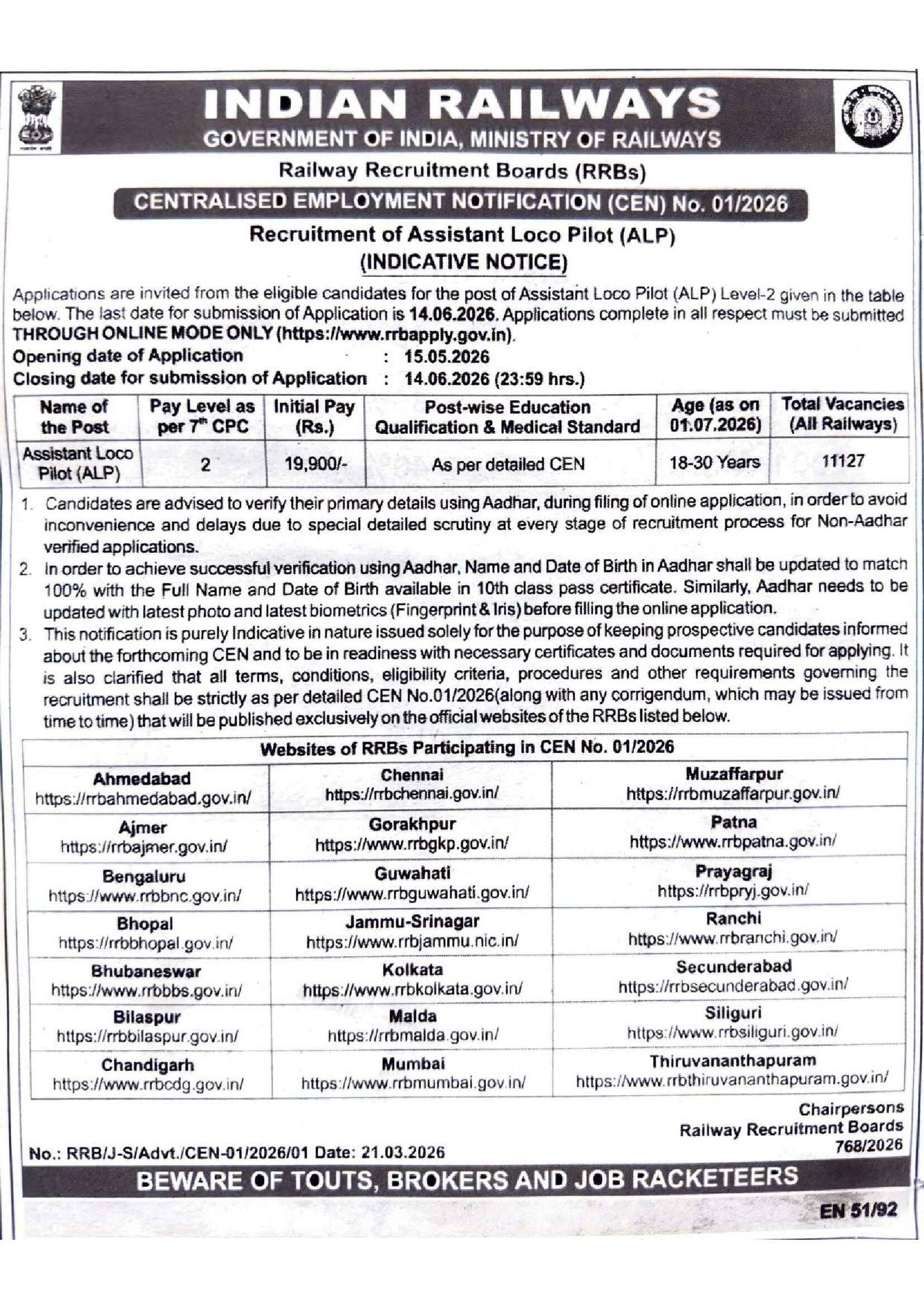 भारतीय रेलवे में सरकारी नौकरी की तैयारी कर रहे युवाओं के लिए बड़ी खुशखबरी है। रेलवे भर्ती बोर्ड (RRB) ने Assistant Loco Pilot (ALP) भर्ती 2026 के लिए नया नोटिस जारी किया है। इस भर्ती के तहत देशभर के विभिन्न रेलवे जोनों में कुल 11,127 पदों पर भर्ती की जाएगी।