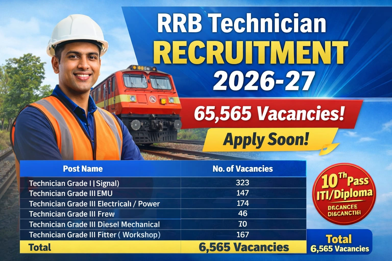 RRB Technician Recruitment 2026-27 : अगर आप सरकारी नौकरी की तैयारी कर रहे हैं और खासकर रेलवे में करियर बनाना चाहते हैं, तो यह खबर आपके लिए बेहद खास है। Railway Recruitment Board (RRB) द्वारा Technician Grade 1 (Signal) और Grade 3 के 6500+ पदों पर भर्ती की तैयारी शुरू कर दी गई है। शॉर्ट नोटिस जारी हो चुका है और जल्द ही फुल नोटिफिकेशन भी आने वाला है।