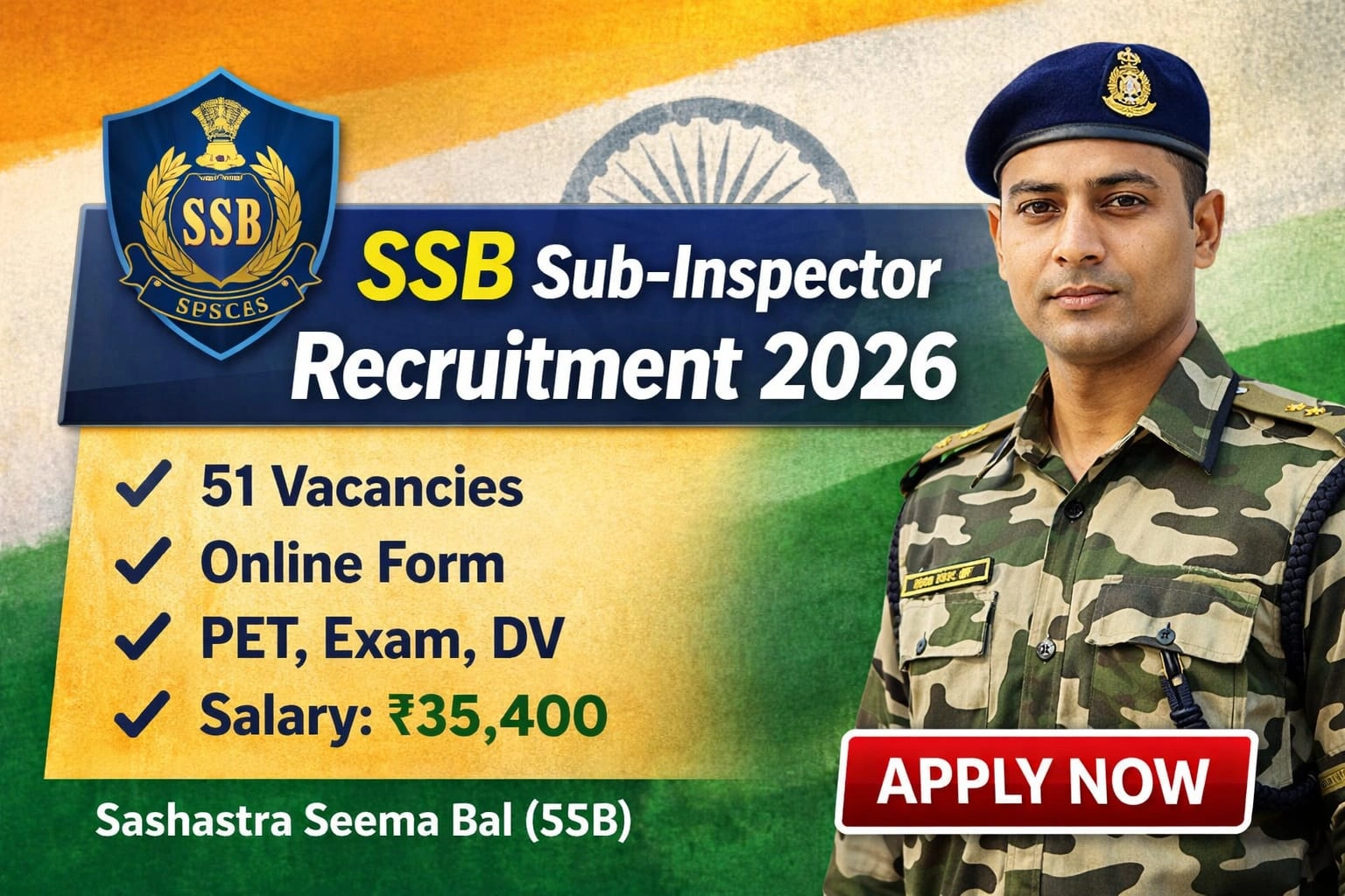 SSB Sub-Inspector Vacancy 2026 : Sashastra Seema Bal (SSB) ने वर्ष 2026 के लिए Sub-Inspector (SI) के 51 पदों पर भर्ती का notification जारी कर दिया है। यह भर्ती All India level पर आयोजित की जा रही है, जिसमें eligible candidates online mode के माध्यम से आवेदन कर सकते हैं। जो भी उम्मीदवार सरकारी नौकरी की तैयारी कर रहे हैं, उनके लिए यह एक शानदार मौका है।