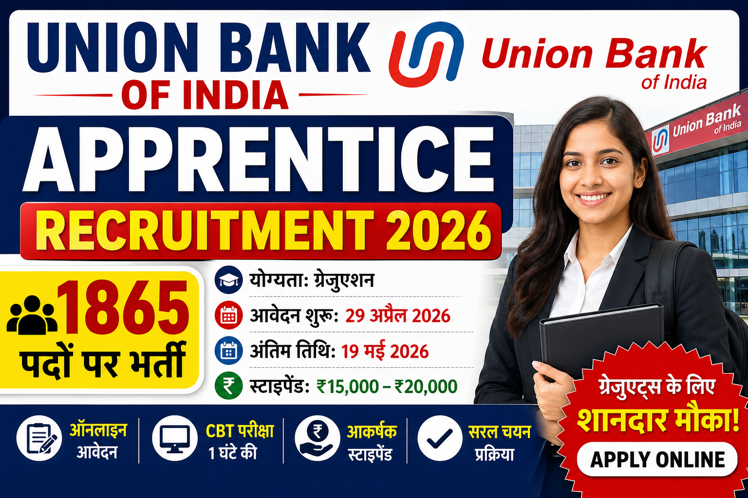 बैंकिंग क्षेत्र में करियर बनाने की तैयारी कर रहे युवाओं के लिए एक शानदार अवसर आया है। Union Bank of India ने Apprentice Recruitment 2026 के तहत कुल 1865 पदों पर भर्ती के लिए आधिकारिक अधिसूचना जारी की है। यह भर्ती पूरे भारत के उम्मीदवारों के लिए खुली है। स्नातक पास अभ्यर्थी इस भर्ती के लिए ऑनलाइन आवेदन कर सकते हैं। चयनित उम्मीदवारों को बैंकिंग क्षेत्र में प्रशिक्षण के साथ आकर्षक स्टाइपेंड भी दिया जाएगा।