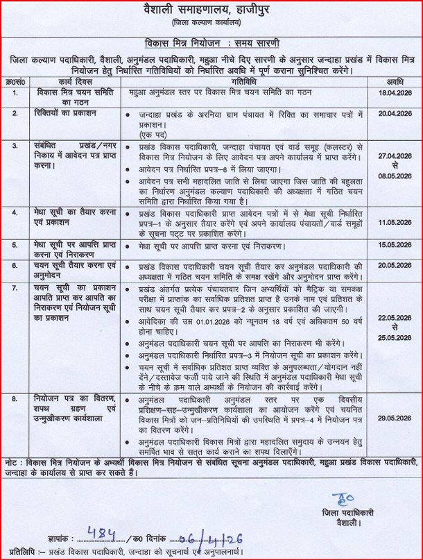 рдмрд┐рд╣рд╛рд░ рд╡рд┐рдХрд╛рд╕ рдорд┐рддреНрд░ рднрд░реНрддреА 2026 тАУ Vaishali рдЬрд┐рд▓рд╛ рдореЗрдВ рдирд┐рдХрд▓реА рдирдИ рднрд░реНрддреА, рдЬрд╛рдиреЗрдВ рдкреВрд░реА рдкреНрд░рдХреНрд░рд┐рдпрд╛